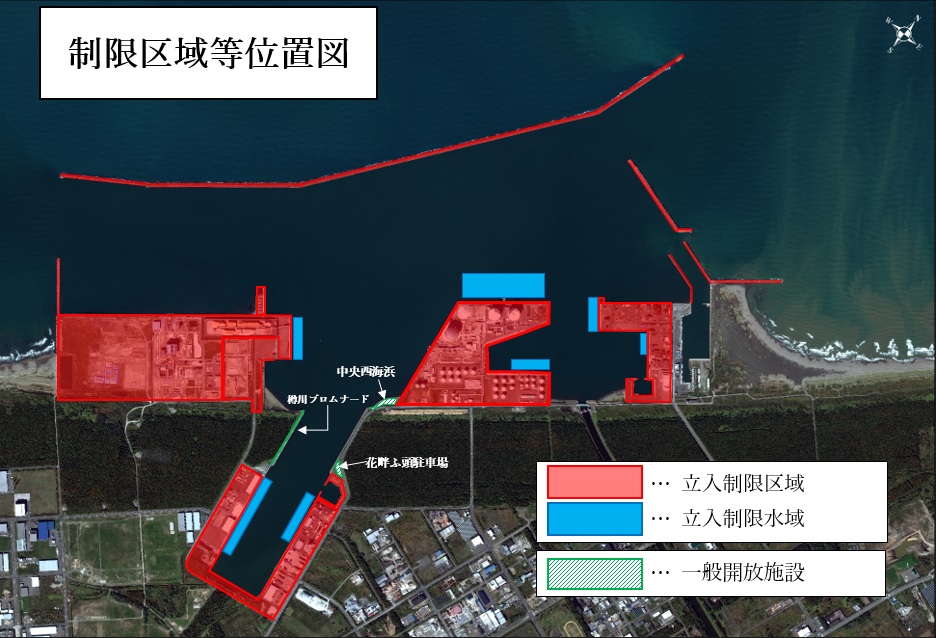 石狩湾新港の下図に示す立入制限区域は、安全上の理由などから、関係者(港湾管理者、港湾荷役関係者、その他港湾管理者が認める者)以外の立ち入りを禁止しています。また、他者所有地には、所有者の許可なく立ち入りはできません。尚、立入制限区域の内外を問わず、港湾施設での火の使用(バーベキュー、たき火、花火等)は禁止しています。
