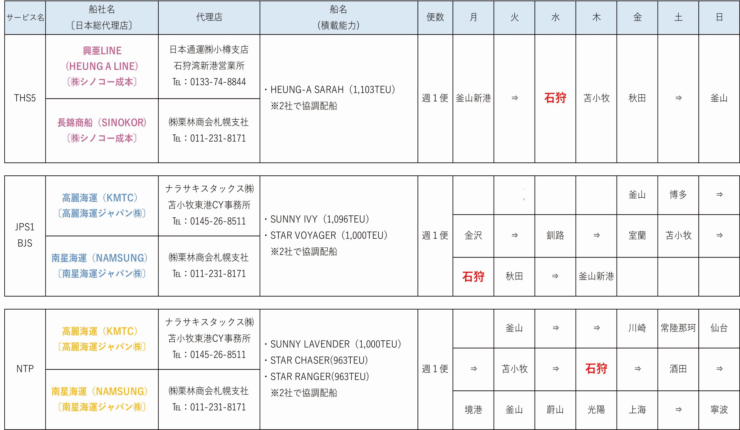 石狩湾新港は、韓国・中国との外貿定期コンテナ航路が週3便就航しています。 大消費地である札幌圏に位置する立地環境や優れたアクセス性、充実した港湾施設などにより、 北海道の国際物流拠点としての役割を担っています。