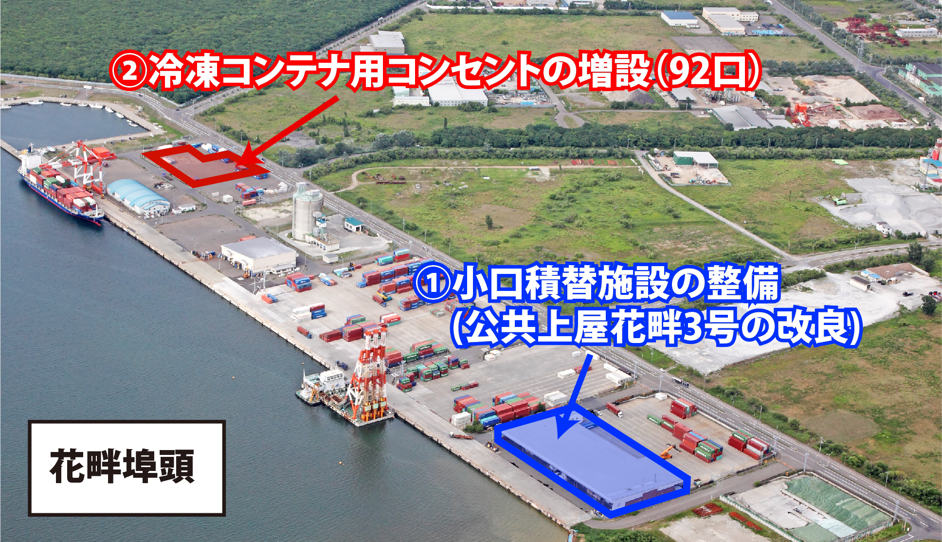 本港では、世界的な食市場の拡大に伴い、新たな輸出成長分野として見込まれる農水産物の輸出に対応するため、「農水産物輸出促進計画(全国第1号:H29)」に基づき、花畔埠頭にて小口積替施設(公共上屋花畔3号の改良)及び冷凍コンテナ用コンセント(増設)の整備を進めてきたところですが、本年3月に整備が完了しました。