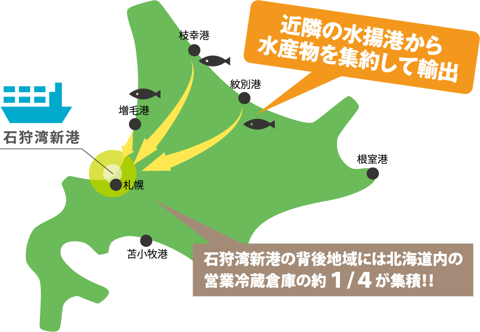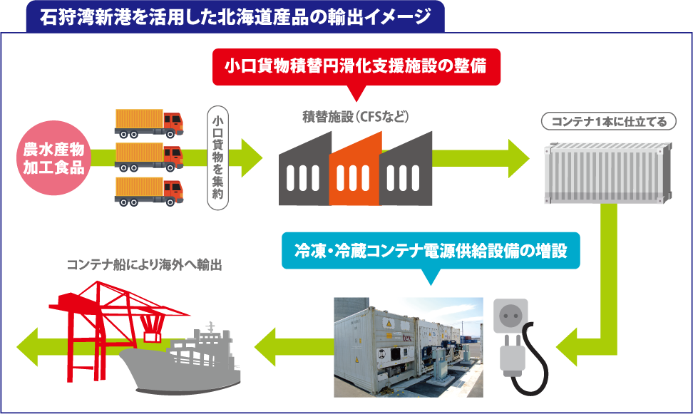 トピックス HOME トピックス 全国第1号! 農水産物輸出促進計画の認定 2017.06.01 全国第1号! 農水産物輸出促進計画の認定 国土交通省港湾局が創設した農水産物の輸出促進に向けた事業制度において、石狩湾新港を含む道内6港湾が策定した農水産物輸出促進計画が、平成29年5月に全国第1号で認定を受けました。 石狩湾新港では、小口貨物積替円滑化支援施設(CFS)の整備と冷凍・冷蔵コンテナ電源供給設備の増設が進められることになり、北海道産品の輸出拠点としての利便性が一層高まります。 港の紹介 遊泳・潜水行為の禁止について 立入制限、海浜地利用、放置等禁止区域 5つの地区 港湾施設・動植物検疫 港の背後地域 自然条件 沿革 振興団体 要覧・広報誌等 ビジネス向け情報 定期コンテナ航路 交通ネットワーク ポートサービス 各種料金 入出港予定 海貨業者・官公署等 申請様式ダウンロード 港湾施設の使用申請について 「石狩湾新港入港のしおり」について 船舶の安全運航確保のための合意事項 港の計画・港湾統計 港の将来計画 臨港地区及び分区 港湾統計 石狩湾新港管理組合について 組織概要 港湾管理者挨拶 石狩湾新港地方港湾審議会 議会 財政 ニュースリリース 港湾BCP 入札工事情報 入札情報 入札制度 工事(委託)情報 入札結果